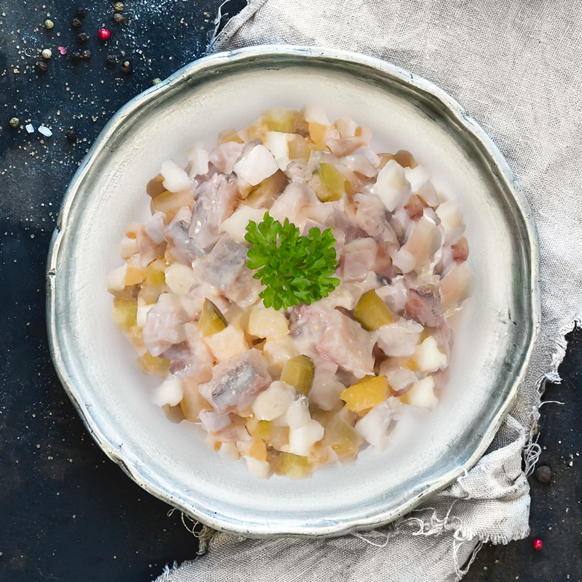 Herzhaft-maritimer Genuss: Seebacher Heringssalat mit Hering, Fleischwurst & saurer Sahne. Einzigartig lecker & vielseitig!